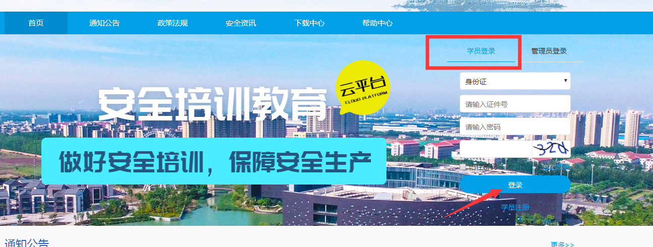 通过浏览器访问济宁市安全培训教育云平台:http://jnaqsc.yxlearning.com/,输入账号密码,点击登录即可进入平台,如下图: